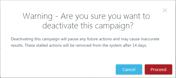 Click PROCEED to deactivate the Campaign. Click CANCEL to close the confirmation and return to the Library without deactivating the Campaign.