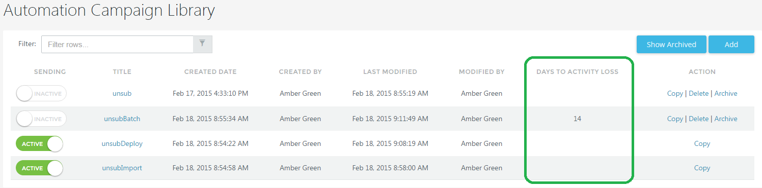 If the campaign is not reactivated in a certain period of time (default of 14 days), all paused actions will be purged from the system, and contacts will not proceed through the automation campaign. Deactivated campaigns display the number of Days Until Activity Loss in the Automation Campaigns list. Campaigns that have never been Active display no number.