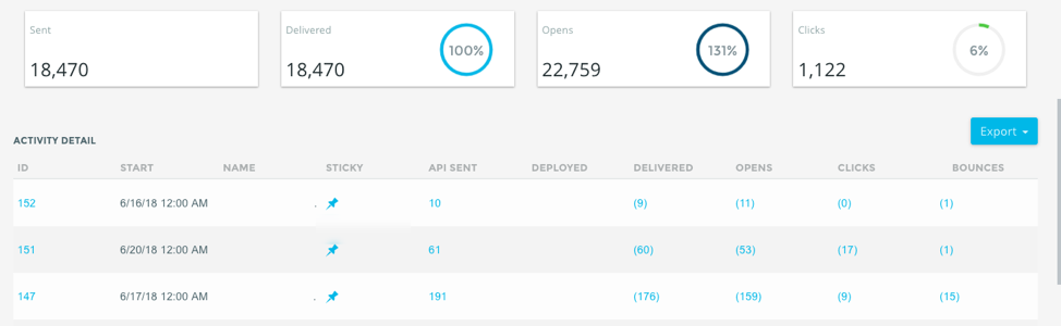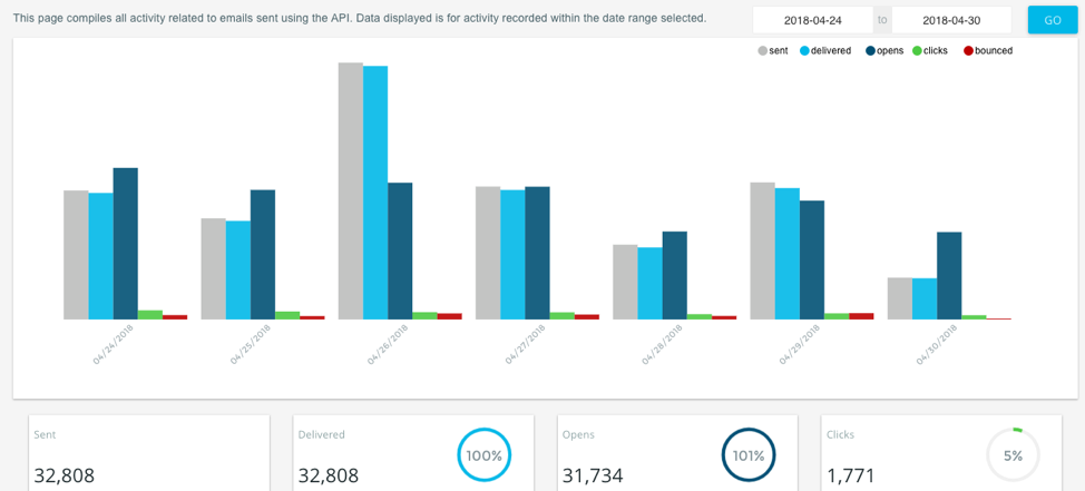 The API Overview provides a breakdown of all email campaigns initiated from a transactional API call. This overview separates any campaigns from those deployed via the UI.