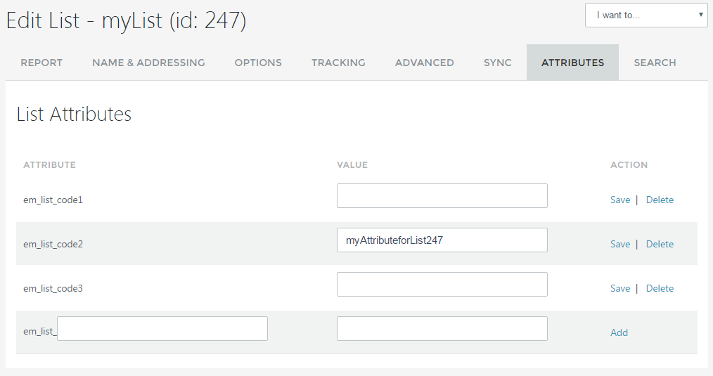 An example use of List Attributes is to support your various Newsletters. If you have separate Lists for each newsletter, you may create attributes to define the Newsletter name, frequency, logo image, and URL to a related site. If you have three newsletters, you can send campaigns which use the same template, such as a generic Welcome message, but insert newsletter specific details based on the targeted List using the List Attribute Tags.