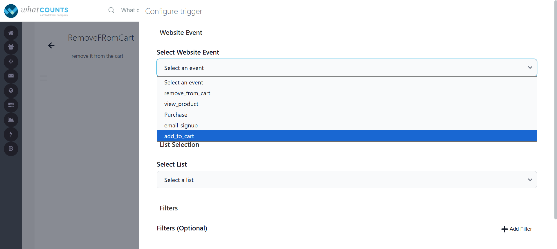 Remove from cart – Occurs when a user subscribes to your newsletter or promotional emails. It allows you to initiate welcome or engagement campaigns.