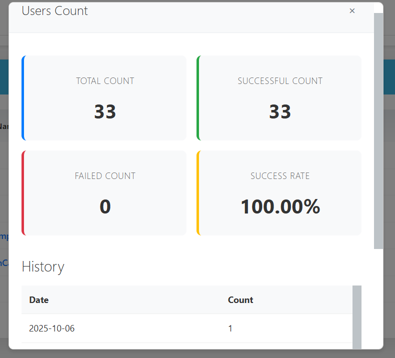 A History section is also provided below, which displays the date-wise breakdown of user counts processed through the automation, in descending order.