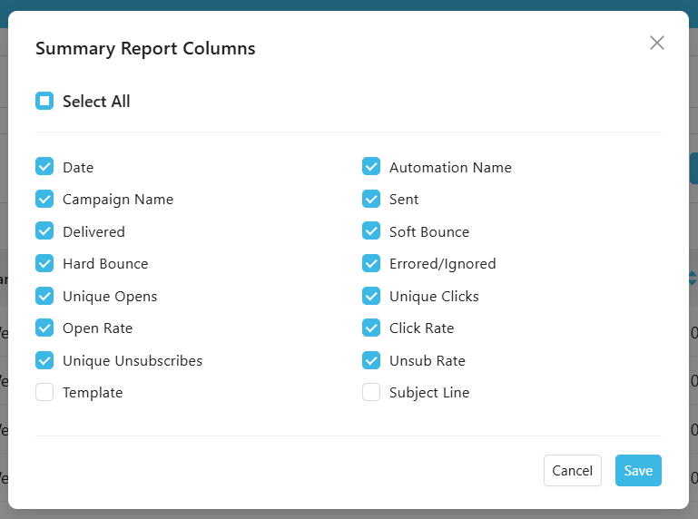 Template and Subject Line are optional columns, and all the other columns that are selected are default columns.