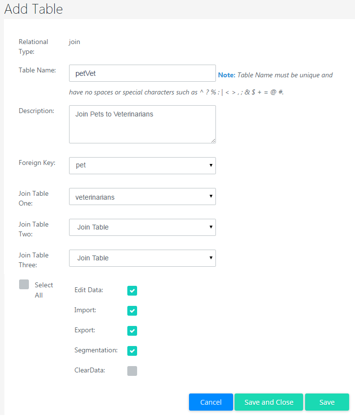 Click SAVE to save the new table and display the Edit Table page. Click SAVE AND CLOSE to save the table and then return to the Relational Tables list. Click CANCEL to close the page without creating the new table.