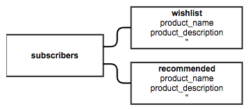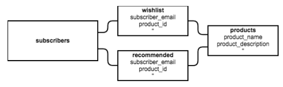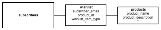 The wishlist and recommended tables are used to join the subscribers and products tables. Each entry includes an identifier for a product in the products table, as well as the subscriber connected to that product. This allows the system to pull in the correct product information for each wish list or recommended item.