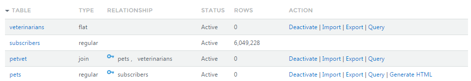 Actions | The Actions depend on the Table Status and include options to: Activate, Deactivate, Delete, Delete Data, Import, Export, Query, Generate HTML. |