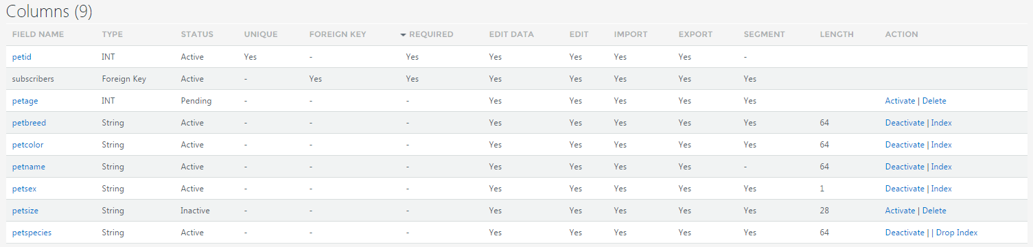 Actions | The Actions depend on the Column Status and include options to: Activate, Deactivate, Delete, Index, or Drop Index. |