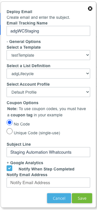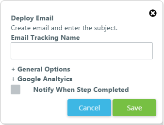 Email Tracking Name: Required textbox to identify the campaign in reporting. The string must be unique for every Deploy Email instance in the Automation Campaign. Use a short, recognizable abbreviation or phrase. For example, a welcome campaign may have several Deploy Email. You could use a series of names like: