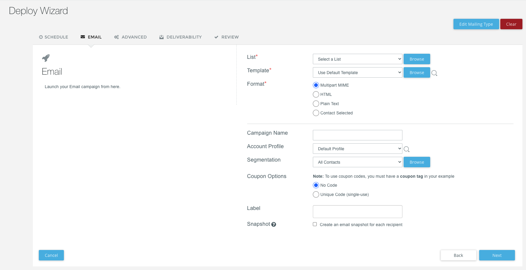 - Before using the deploy wizard, you should already have your email lists and associated segmentation rules already created.