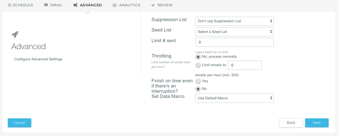 The Advanced Settings heading allows you the ability to apply a Seed List or Suppression List to your campaign, limit the total number of emails sent, or activate Data Macros.