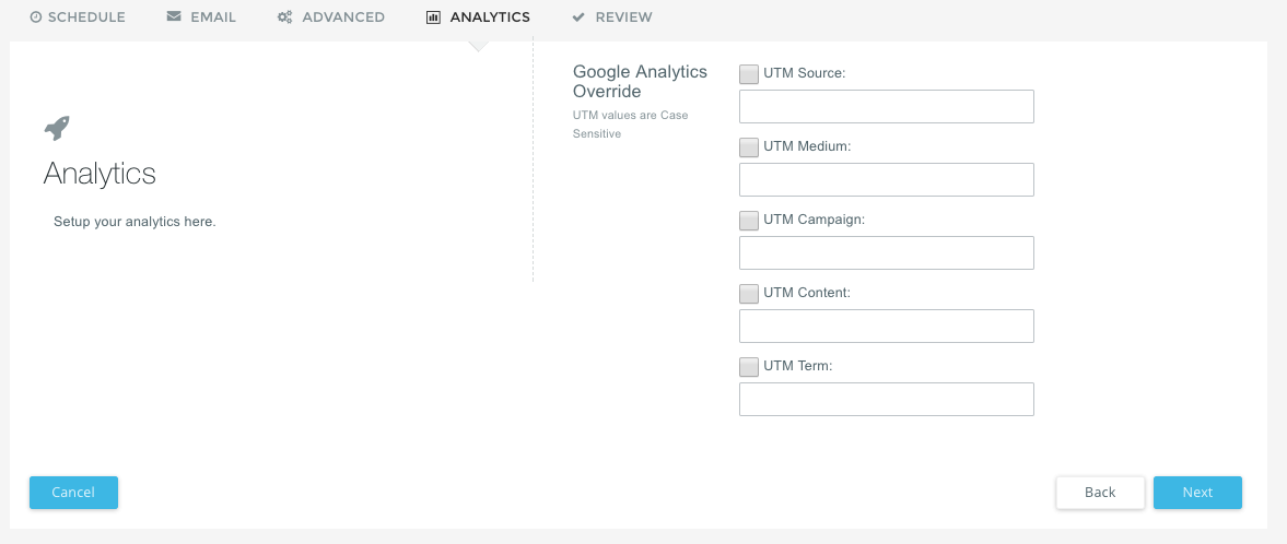 If you have Google Analytics enabled on your Realm, you can confirm or change the UTM parameter settings for the campaign. This is helpful if you want to override the default settings for one individual email deployment.