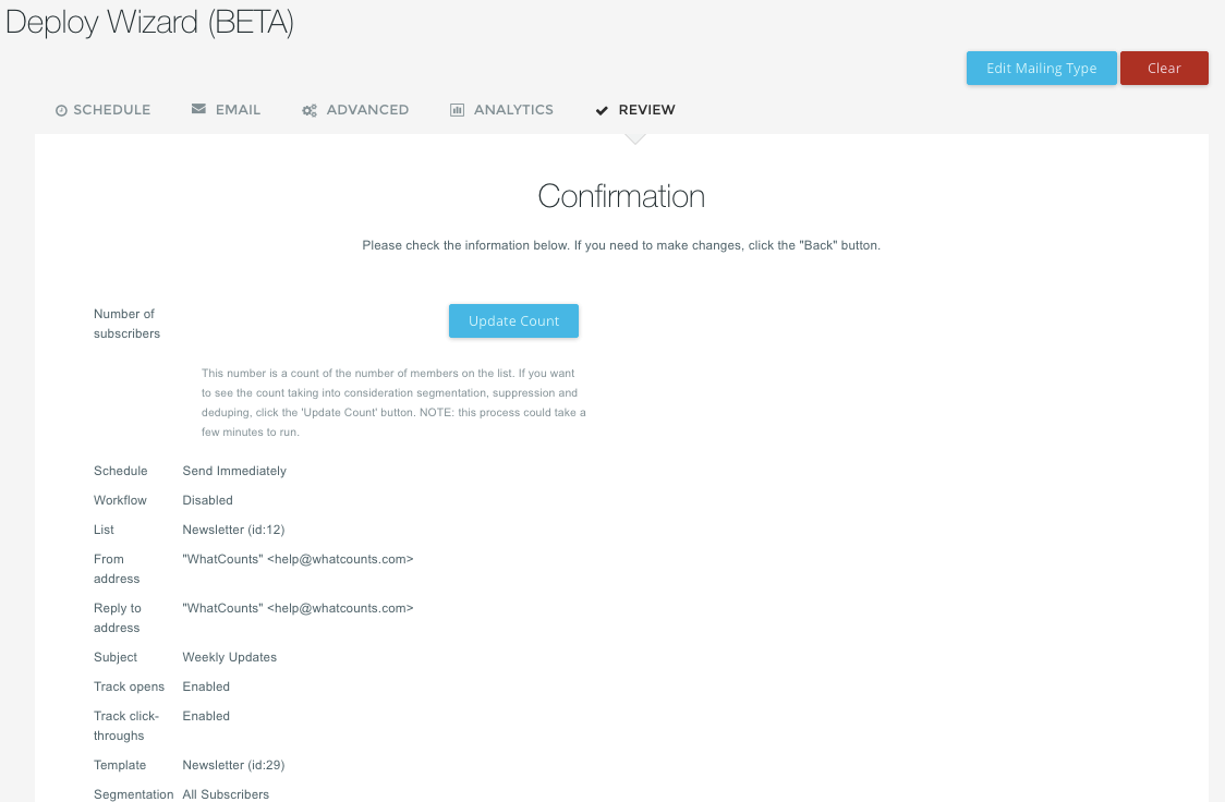 The final screen allows you to confirm that all the settings for your email campaign are correct. This will be the final confirmation screen prior to email deployment, so it is important to confirm the selections here are correct.