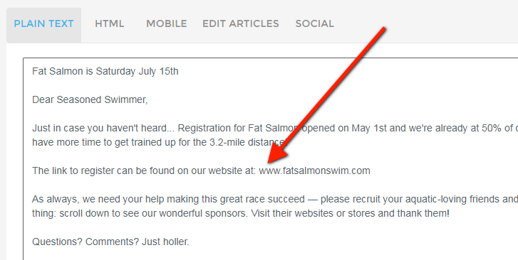 To allow for click-through tracking, the URLs in your content are replaced with special tracking links in both Plain Text and HTML content. In Plain Text messages, tracked links are not hidden behind HTML code so contacts who view your Plain Text campaigns will see the full tracking URLs.