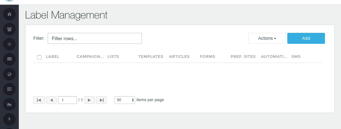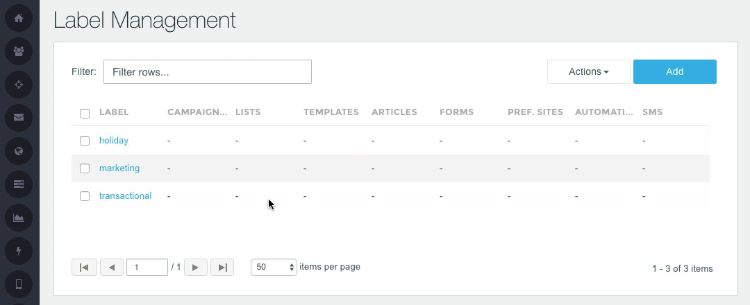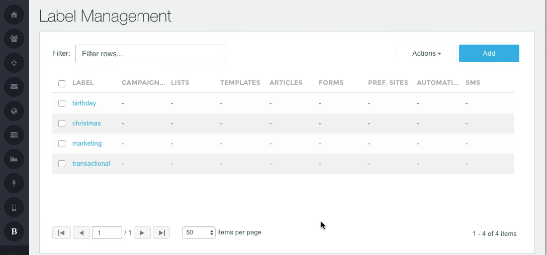 The Label Management page allow you to view/search all existing Labels and their usage count in Campaigns, Lists, Templates, Articles, Forms, Preference Sites, Automations, and SMS messages. This is also where you can create new Labels, as well as edit and delete existing Labels. To get you started there is a selection of default labels to use for tagging and grouping of your campaigns.