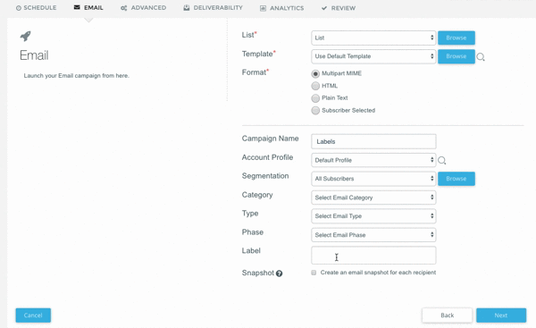 From the Deploy Wizard, you can tag a Campaign with Labels before it is deployed. To tag a Campaign from the Deploy Wizard navigate to TASKS > DEPLOY WIZARD. On the second step of the Deploy Wizard you will see the Labels field at the bottom