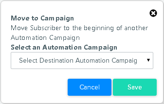 The Move to Campaign action allows you to move Contacts in one Automation Campaign to another Automation Campaign. For example, from a Welcome campaign, you may wish to move Contacts who click the Welcome message within 2 days into a Special Offer campaign, and those who do not click or open remain in the Welcome workflow to receive other reminders.