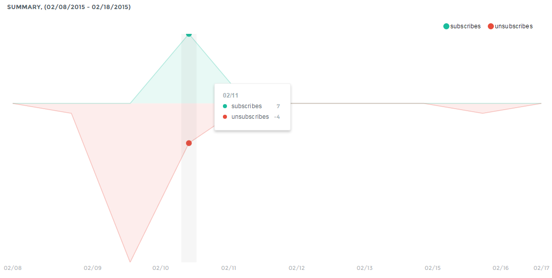 The Summary Line Graph displays counts of all Subscribes and Unsubscribes per day in the Date Range defined. Subscribes appear in green and Unsubscribes appear in red. To see the totals for a specific day, mouse over the chart and a popup for that date will display.