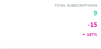The Subscriptions totals box gives a quick overview of the total number of subscriptions and the change during the Date Range. The number of current Subscriptions is totaled in green. Unsubscribes for the Date Range are totaled in red. The percentage change in subscriptions is displayed in red or green depending on how the total changed over the Date Range.