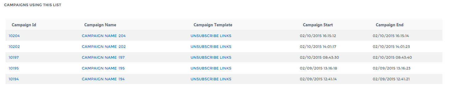 The Campaigns List displays all campaigns published within the Date Range for the List. Each Campaign is listed in order of Campaign ID and includes the Campaign Name (if it is defined), the Template deployed, the Campaign Sent date, and the date the Campaign Ended.