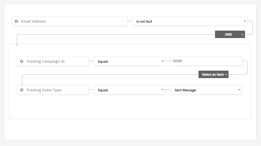 - Change the operator between each pair of Tracking Campaign ID and Tracking Event Type conditions to AND so they will be evaluated together.