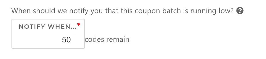 Next, enter or edit when you’d like to be notified that your batch is running low, so you can upload more coupons. You can do this by designating a threshold. For example, if you enter 50, you’ll be notified when 50 codes remain.