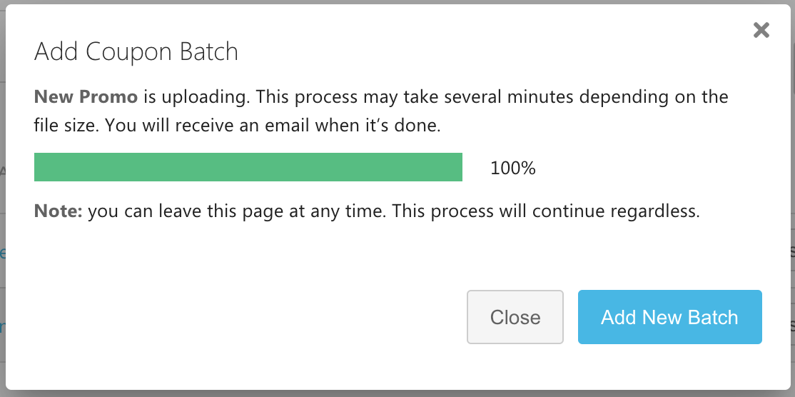 Save the batch. The upload process may take several minutes depending on the number of codes. You can close this pop up at any time, regardless of how much progress has been made, or add a new batch.