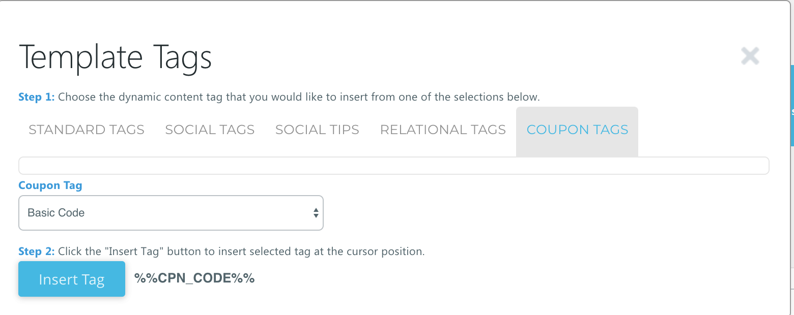 Go to the Coupon Tags tab, select “Basic Code,” and click “Insert Tag.”