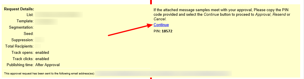 In order to verify the approval is being made purposefully, an option is available to require a two-step process. When you receive the Workflow Approval email, the options to Approve, Resend, and Cancel are replaced with a link to Continue and a PIN.